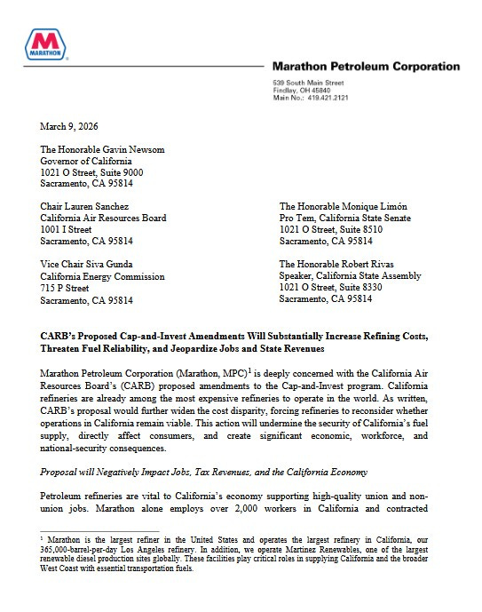 Marathon Petroleum Corporation (MPC), the largest U.S. refiner and operator of California’s largest refinery (365,000 barrels per day in Los Angeles), plus a major renewable diesel facility, expresses deep concerns over the California Air Resources Board’s (CARB) proposed amendments to the Cap-and-Invest program. Addressed to Governor Newsom, CARB Chair Lauren Sanchez, CEC Vice Chair Siva Gunda, Senate Pro Tem Monique Limón, and Assembly Speaker Robert Rivas, the letter argues that the amendments would dramatically increase operating costs for refineries, making them unviable and leading to widespread negative consequences.