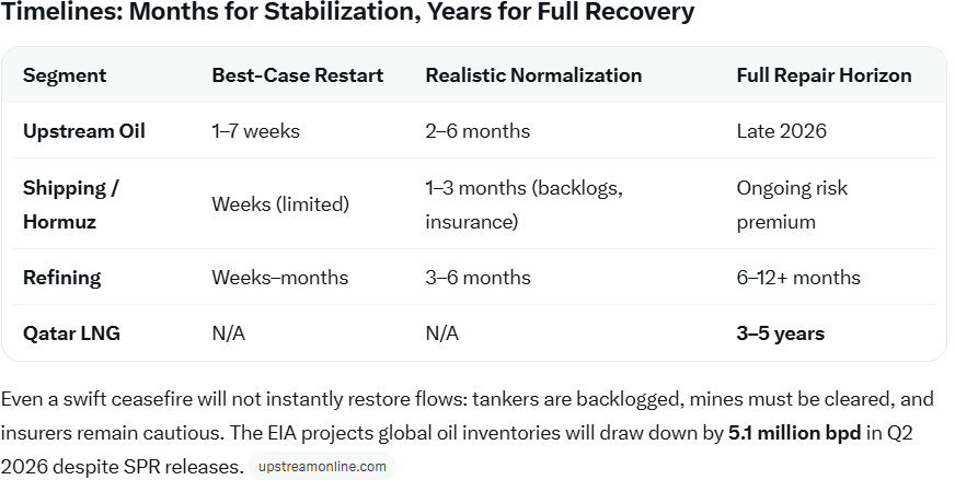 The Iran war has removed ~9.1 million bpd of oil, ~2 million bpd of refining, and 12.8 MTPA of LNG for years. Shipping and confidence will take months to normalize; full LNG repairs will take years. Markets are already pricing in a higher-for-longer regime, with $82/bbl emerging as the new oil-price floor. Investors should watch: